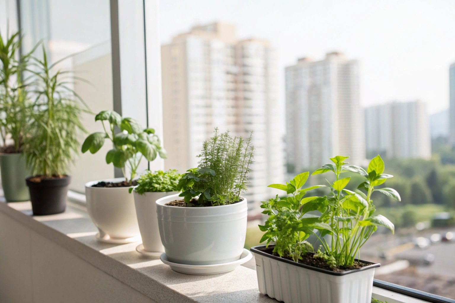 A clean, modern background image for a website homepage about urban and indoor gardening in the United States. Aesthetic composition featuring soft natural greens, small apartment plants, balcony pots, herbs growing in small containers, pet-safe houseplants, and climate-friendly balcony plants. Minimalistic urban elements in the background (soft blurred city outlines) to reflect US city living. Bright natural lighting, fresh botanical tones, soft shadows, and a calm, inviting atmosphere. High-quality, realistic, professional garden lifestyle look. Aspect ratio 300:200.